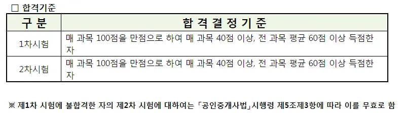 2차 시험 매 과목당 40점 이상 전 과목 평균 60점 이상 득점